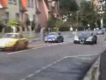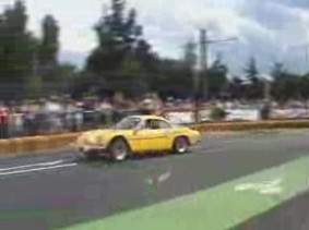 画像は投稿ビデオから拝借、線路の上は滑りそう、前を走るのはデニーのアルピーヌ。ブガッティは良い音をしていた、GT40の音も良かった。