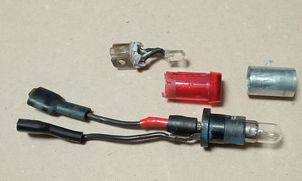 抵抗の有るフィラメントの電球じゃないとダメ見たい,小さい電球の手持ちが無いのでブリキを丸めてソケットを作り、ヘッドライトのポジションランプを継ぎ足した、カッコ悪い。